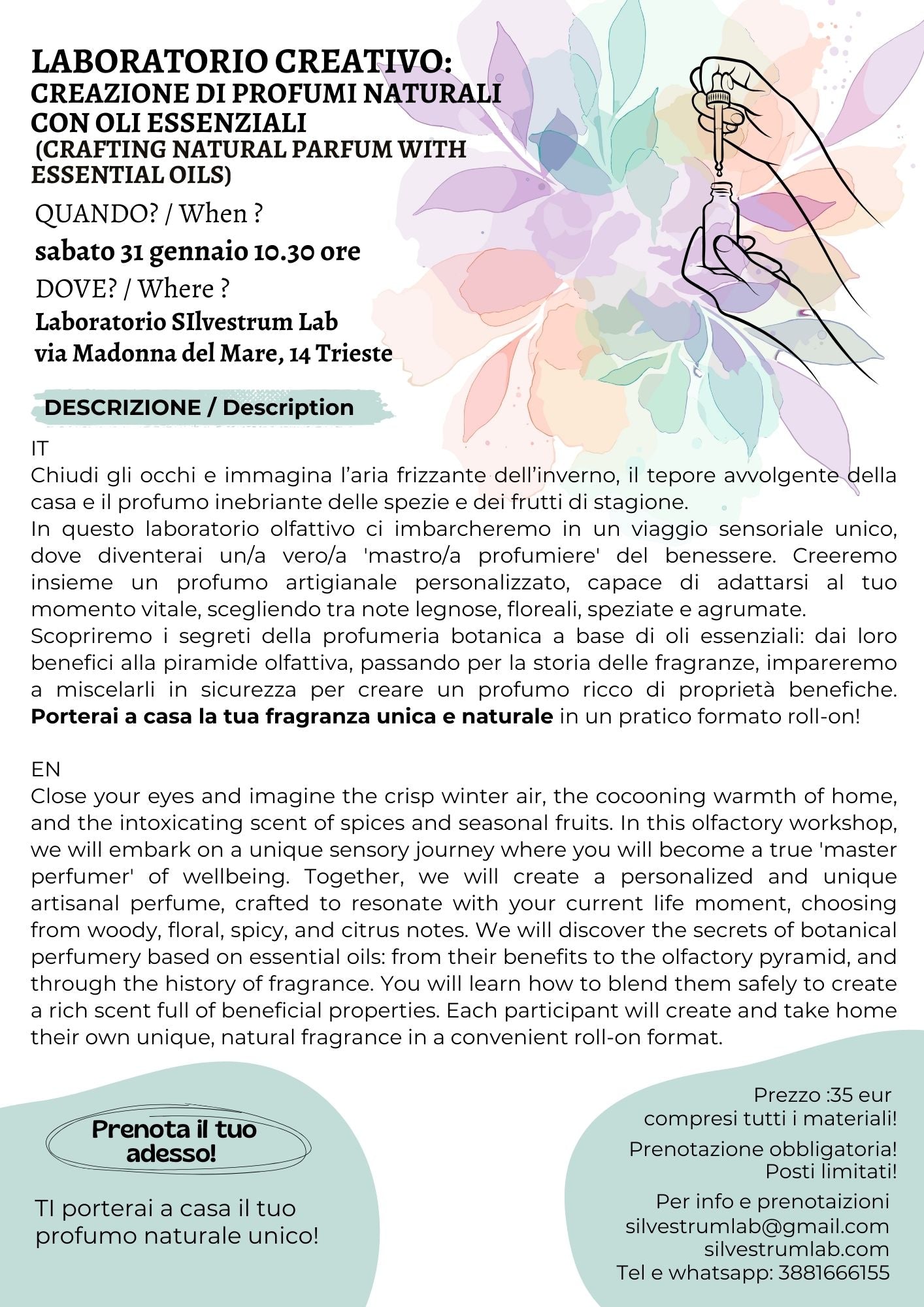 In questo laboratorio olfattivo ci imbarcheremo in un viaggio sensoriale unico, dove diventerai un/a vero/a 'mastro/a profumiere' del benessere. Creeremo insieme un profumo artigianale personalizzato, capace di adattarsi al tuo momento vitale, scegliendo tra note legnose, floreali, speziate e agrumate.