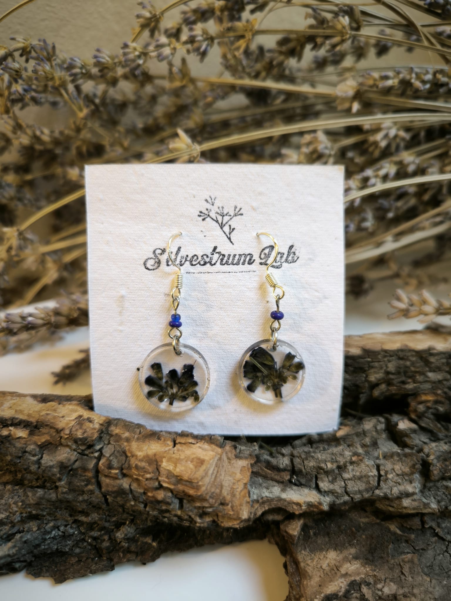 Orecchini fatti a mano con fiori veri pressati di Lavanda e resina ecologica, arricchiti con eleganti perline artigianali di vetro di Murano.